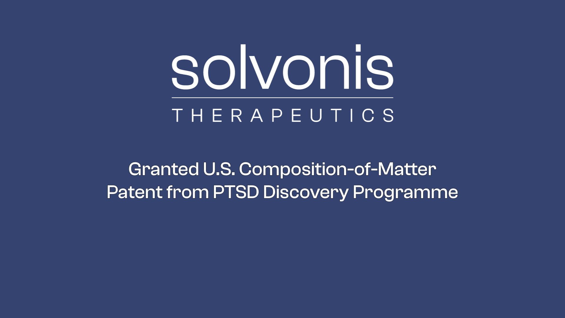 Solvonis Therapeutics plc (LSE: SVNS), an emerging biopharmaceutical company developing innovative small-molecule therapeutics for high-burden central nervous system (“CNS”) disorders, announces it has been granted a U.S. patent by the United States Patent and Trademark Office (“USPTO”) covering a monoamine modulator compound series arising from its proprietary post-traumatic stress disorder (“PTSD”) discovery programme.